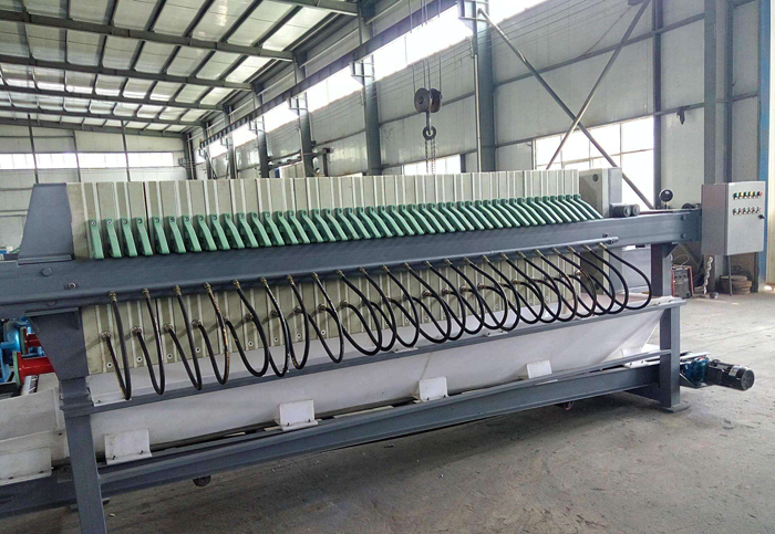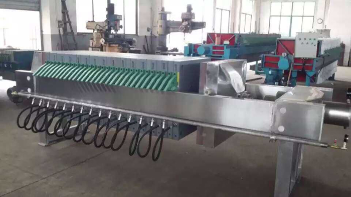 產(chǎn)品描述:隔膜壓榨壓濾機(jī)由隔膜板和廂式濾板排列組成濾室,在輸料泵的壓力作用下將漿料輸入濾室,通過過濾介質(zhì)(濾布)將漿料中的固體和液體分離,當(dāng)固體形成濾餅后,向隔膜板通入高壓空氣,對(duì)濾室內(nèi)的固體充分壓榨,降低濾餅含水率。對(duì)于粘性物料的過濾及含水率要求高的用戶,此機(jī)更有其獨(dú)特的特性。